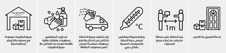 سوف نحرص دائماً على إتباع جميع الإجراءات الصحية ووسائل التعقيم والنظافة لنوفر لكم تجربة تسوق مريحة وآمنة من المنزل